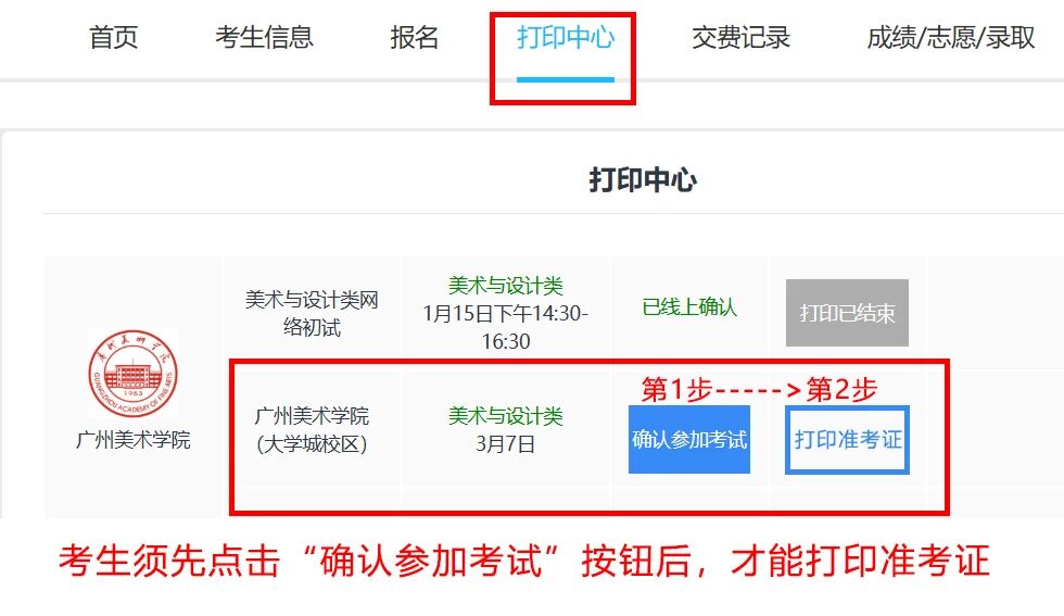 我校不设现场确认及打印准考证,考生须在3月3日10:00-3月6日10:00使用电脑浏览器登陆我校报名系统:https://user.artstudent.cn/login 确认参加考试并打印准考证,按准考证相关要求备考。提示:只能在电脑网页版的“打印中心”菜单里面打印准考证。