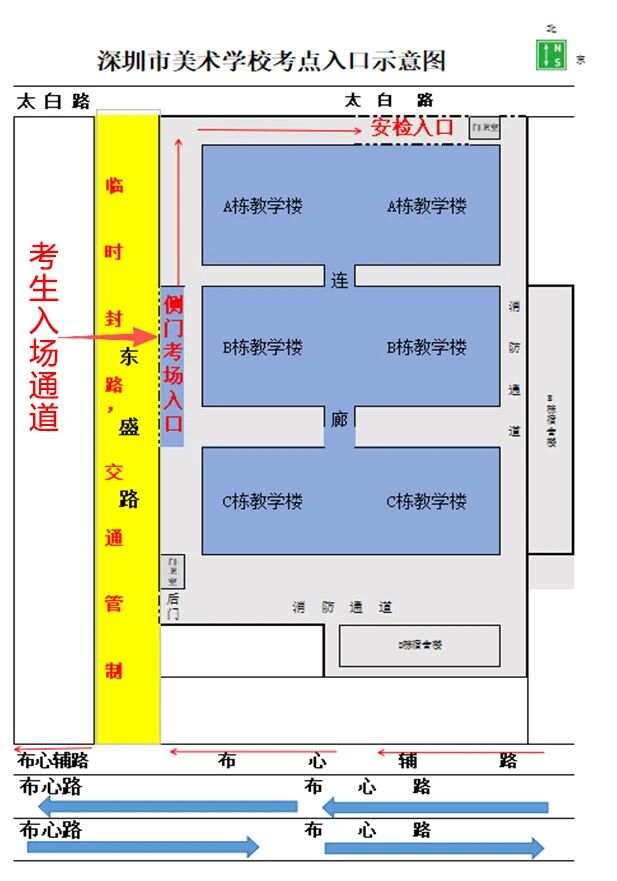 考点位于深圳市罗湖区东盛路68号或百度搜索深圳市美术学校(深圳市罗湖区东盛路68号),因入场安检需要耗费较多时间,请考生于考试当天至少提前1小时到达考点,凭准考证,身份证进入考点。考生只允许考前一天到考点门口查看考场分布图,熟悉线路及考试规则,考生不允许进入考点。学校食堂不提供对外就餐服务,请考生提前做好用餐准备。深美考点周边交通相对拥挤,考试当天太白路和东盛路会拥堵,考生可选择:(1)乘坐地铁3号线在水贝地铁站A口出站,步行约859米到达深圳市美术学校考点北门;(2)乘坐地铁5号线在太安地铁站E口出站,步行约1.1千米到达深圳市美术学校考点北门;(3)乘坐公交到松泉公寓站下车,需步行约252米到达深圳市美术学校考点门口;乘坐公交到太白路中站下车,需步行约278米到达深圳市美术学校考点门口。